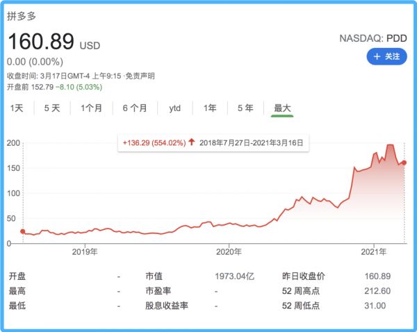 上市后,拼多多依然势如破竹。在消费者不断的质疑声中,平台依靠“百亿补贴”策略和新品牌计划,一面拓展消费人群,一面补充商品类别,终于初步实现了服务中国最广大用户的目标,公司市值也较上市时累计增长5倍多,直逼2000亿美元。