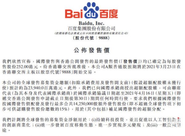 @虎嗅【百度:香港 IPO 最终发售价为 252.00 港元,3 月 23 日开始交易】百度昨日在港交所公告称,国际发售与香港公开发售的最终发售价均已确定为每股发售股份 252.00 港元,本公司 A 类普通股预期将于 2021 年 3 月 23 日在香港联交所主板以股票代号 “9888”开始交易。