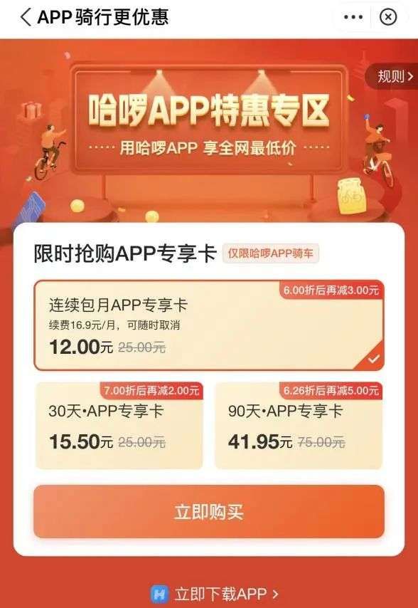 在支付宝上购买哈啰单车连续包月卡的价格为15元,同为连续包月卡,哈啰单车App的专享价为12元;30天月卡,支付宝小程序的价格为16.9元,哈啰单车App的价格为15.5元。