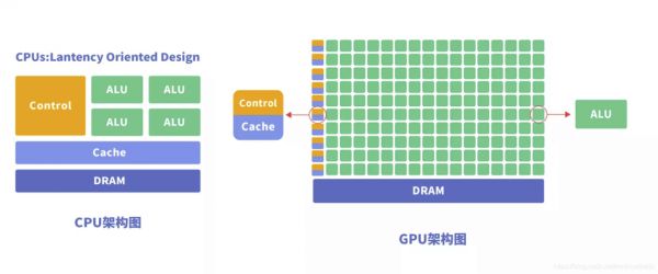 CPU与GPU结构对比图:GPU拥有更多的ALU(逻辑运算单元)