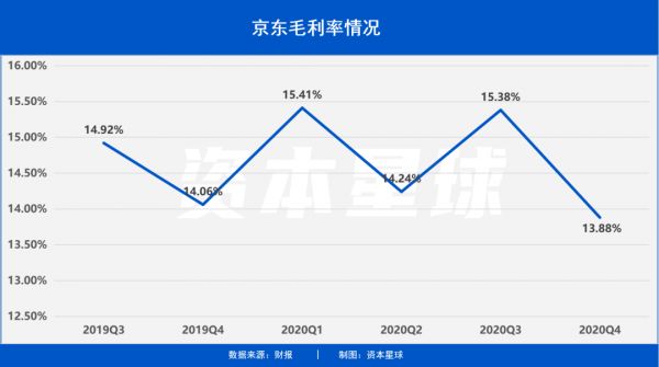 为了在下沉市场获得更多关注和订单,京东不得不采取以价换量的策略,即通过“补贴”换取增量。但这将导致公司的成本上涨和毛利率下滑,数据显示京东2020年Q4的销售毛利率为13.88%,相比Q3下降1.5个百分点,京东方面表示,主要是平台业务的毛利率有所下滑。