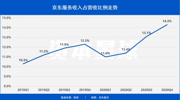 根据财报,京东2020年第四季度实现营业收入2243.3亿元,同比增长31%。其中,商品收入达1922亿元,同比增长28.4%,占总营收的85.7%;服务收入321亿元,同比增长53.2%,占总营收的14.3%。