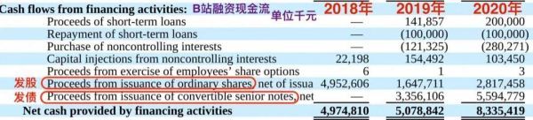 为不断扩充专业内容以及扩大市场影响力,B站这三年进行了积极的融资活动。这里对照融资现金流量表做一个梳理:2018年的近50亿元融资主要是IPO发行的4.43亿美元(扣除手续佣金后的净额),加上当年10月份腾讯追加的3.17亿美元;2019年的51亿元融资主要包括5亿美元的可转债(票面利率1.375%),以及公司增发、加上原有股东出售的总计2000多万股ADR所得;2020年的83亿元融资主要由6月份又发了一轮8亿美元的可转债(票面利率降至1.25%),此外还有索尼入股的4亿美元现金所得。算上IPO,B站三年里通过发债和发股已经融了183亿元左右。除了利用全球低利率市场进行低成本的债券融资外,就是引入腾讯、索尼、阿里等战略投资者,全部都有业务上的合作,比如视频版权、游戏和广告。