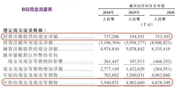 据20-F年报及本次招股书,B站2018-2020年的经营现金流分别为7.37亿元、1.95亿元和7.53亿元。从正的经营现金流到负的净利润,B站主要由于一系列非现金项目的逐年增加所致,包括版权等无形资产摊销、会员费等递延收入、对供应商的应付账款等。