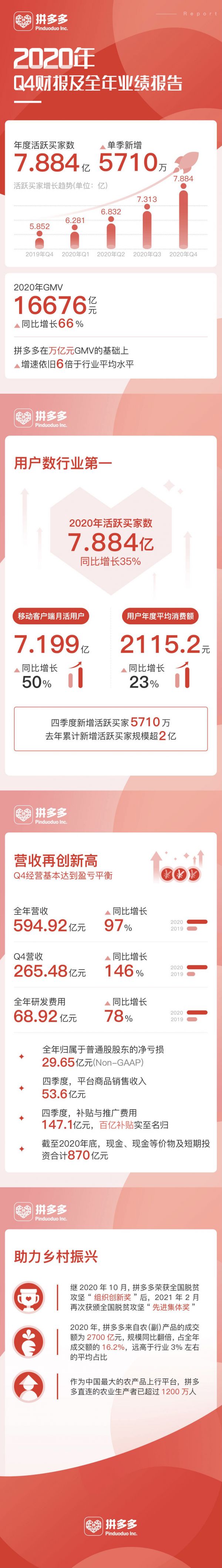 拼多多2020年年度活跃买家数7.88亿,去年同期5.852亿,超过阿里巴巴。全年每活跃用户消费额为2115.2元,同比增加23%。