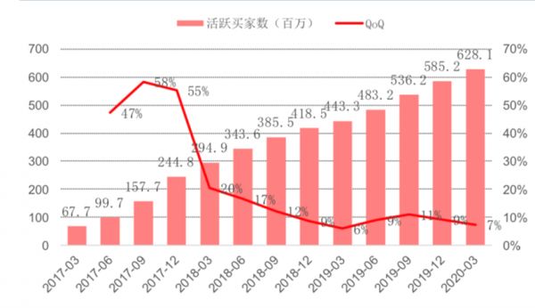 2019年以来,虽然速度不如以前迅猛,每个月都在用拼多多的人逐个季度地在增长。截止2020年三季度,拼多多月活跃用户数为6.43亿。
