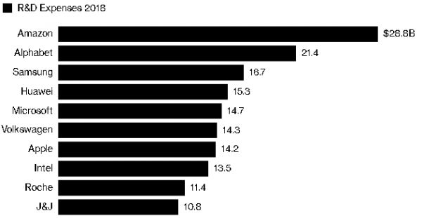 据彭博社数据,以货币计算,华为2018年的研发支出排名第四。亚马逊以288亿美元排名第一,谷歌母公司Alphabet以214亿美元排名第二,三星电子公司以187亿美元排名第三。微软、苹果和英特尔分别为147亿美元、142亿美元和135亿美元,排名依次为第五、第七和第八。