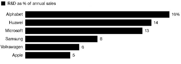 此外,华为2018年研发支出占该公司营收比例为14%,按照研发支出占据营收比例的大小进行排名,华为位列第二,只落后于谷歌母公司Alphabet。