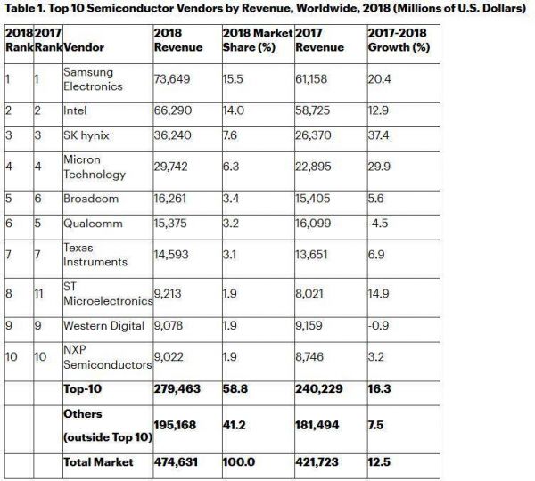 由于DRAM市场蓬勃发展,三星电子成为第一大半导体供应商。目前,该公司88%的收入来自内存销售。Gartner研究副总裁Andrew Norwood表示:“三星的领先优势主要是建立在硅芯片上,2019年这一优势将消失。”