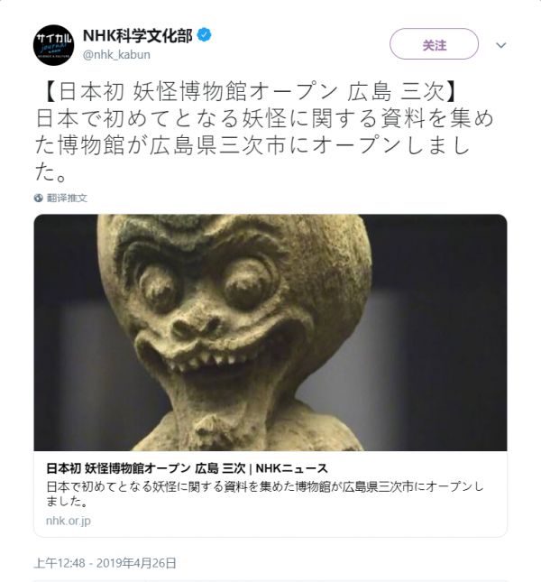 据日本NHK新闻消息,日本第一个以妖怪为主题的博物馆于26日在日本广岛县三次市开馆。这家博物馆名为三次怪物纪念馆,建设花费约12亿日元(约合人民币7232万元)。妖怪研究专家汤本豪一为这家博物馆捐赠了约5000件相关的资料。博物馆展出了关于妖怪的木制雕像、悬挂卷轴等约160件材料,馆内还设置了图片卷轴样式的妖怪图像屏幕等。