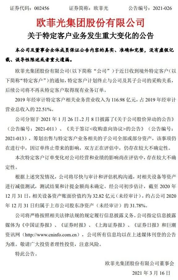 2021 年 3 月 17 日,欧菲光发布公告披露,境外特定客户计划终止与公司及其子公司的采购关系, 后续公司将不再从特定客户取得现有业务订单。2019 年经审计特定客户相关业务营业收入为 116.98 亿元,占 2019 年经审计营业总收入的 22.51%。