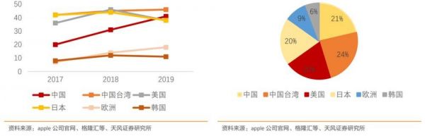 苹果的供应链组成方面,2019 年数据显示,来自中国台湾的供应商数量最多,达到 46 家,而中国大陆(30 家)加上香港(10 家)总计有 40 家,大陆 2017 年到 2019 年的供应商数量翻了一倍。
