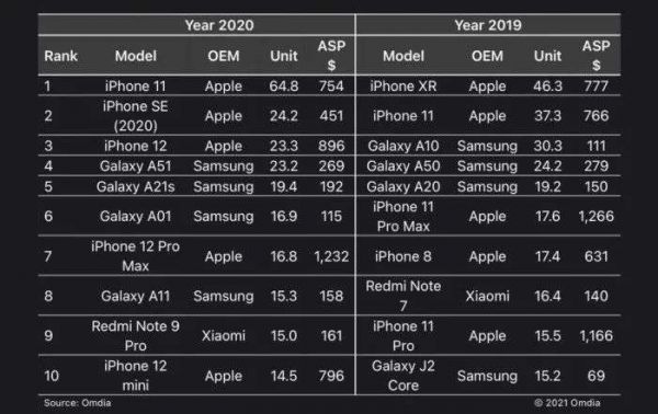 市场调研机构Omdia公布了2020年全球最畅销的智能手机排行榜,从榜单可以看出,三星旗舰机型并未上榜,反倒是中端机撑起了自家手机业务。