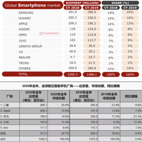 从大的方向来看,三星取消Galaxy Note系列,将重心放在冲击销量的中端机上,其实是大势所趋,因为其他厂商也是这么做的,以新款iPhone XR和iPhone 11为例,2020年之前,苹果手机全球出货量和市场份额都在下滑,Counterpoint统计的数据显示,2019全年,苹果手机的出货量为1.962亿台,同比下降4.9%。