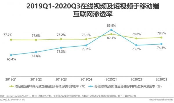 据UserTracker数据显示,从2019Q1-2020Q3,我国在线视频移动端渗透率维持在75%以上,短视频渗透率从65.4%上涨至74.3%。