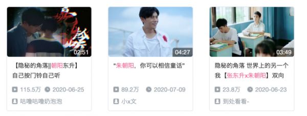 去年的话题网剧《隐秘的角落》,除了“一起爬山吗?”等热梗,主要角色的CP也在B站掀起了创作热潮:张东升X朱朝阳、严良X朱朝阳、朱朝阳X叶驰敏、朱朝阳X叶军等等搭配各具特色。“朝阳东升”CP视频最高点击量突破了115万。