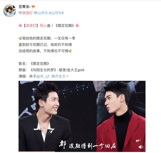 在这些平台活跃的CP粉,不仅在一个集体中找到了归处,在很多时候,提炼出人类关系中最美好部分的CP文化,更给予了粉丝一段替代性满足的体验。在嗑CP的时候,我们不需要担心那些柴米油盐、狗血背叛,人与人之间的关系被蒙上了一层最甜蜜的滤镜。