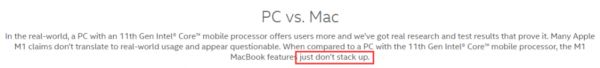 网站与广告风格一致,通过对比,不断夸赞配备了英特尔处理器的 PC 设备,同时对苹果的 M1 Mac 系列提出各种缺陷,甚至还指出 Mac “不靠谱”(just don’t stack up)。