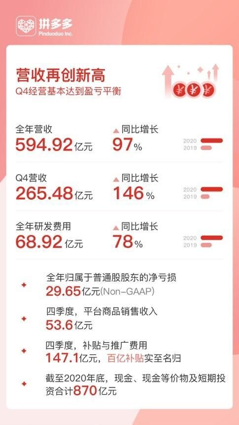 我们看到,继上个季度首次实现盈利后,拼多多再次出现单季亏损。2020年四季度,全年归属于普通股股东的净亏损为29.65亿元,同比收窄30%。