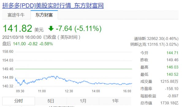 伴随着拼多多最新财报发布以及黄峥辞去CEO的消息,拼多多盘前股价大跌,盘中一度跌近13%,收跌7.1%。