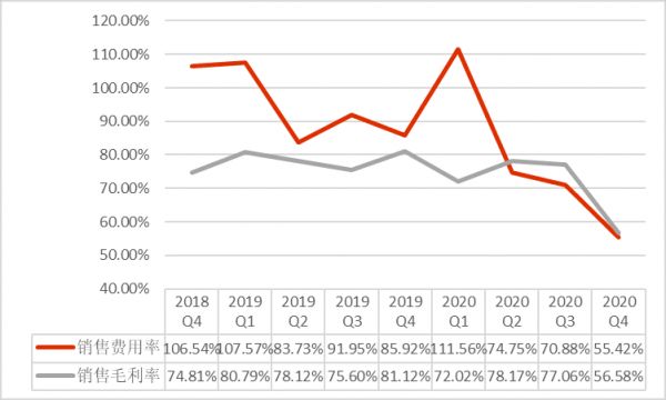 这一方面与拼多多的销售费用率下降相关,根据虎嗅妙投整理数据(如下图)显示:拼多多销售费用率从2018年Q4的106.54%下降至2020年Q4的55.42%,但毛利率也由2018年Q4的74.81%下降至2020年Q4的56.58%。