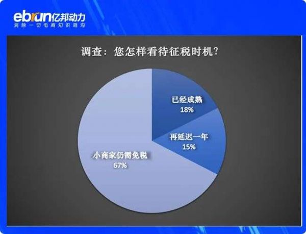 针对电商税全面征收的时机,只有18%的受访者认为时机已经成熟。有15%认为,还需要再延迟一年或更久,多达67%的受访者认为,中小商家依然需要长期免税保护。