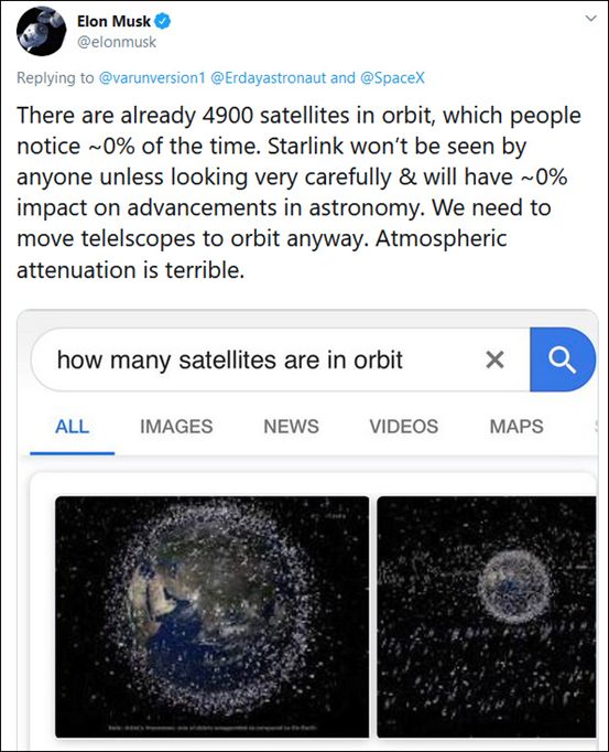 马斯克曾反驳过专家的质疑,“轨道上已经有4900颗卫星了,人们几乎不会关注这些,如果不是仔细看,没人会注意到‘星链计划’的卫星,它们也不会对天文学的进步有任何影响。”最后,他还建议将天文望远镜放入轨道。