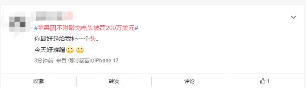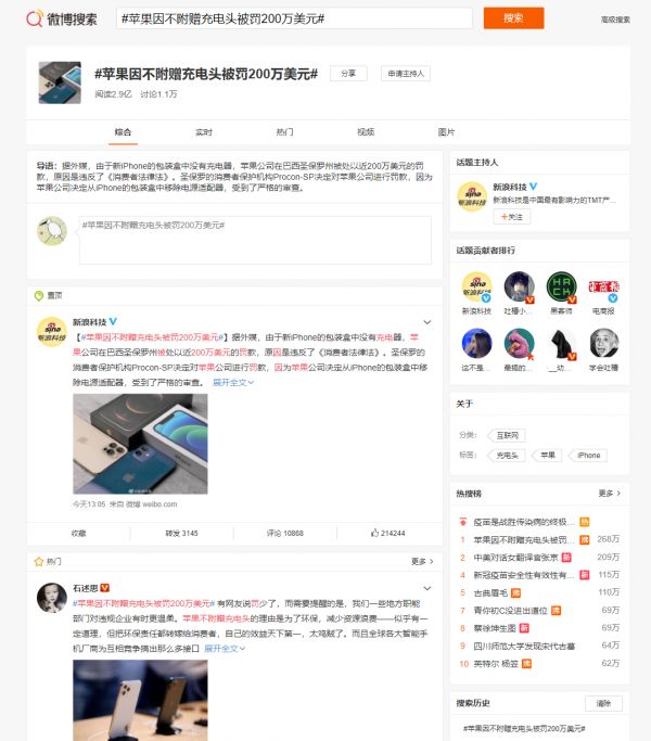 有意思的是,本次苹果登上新浪微博热搜并不是因为发了什么新品,也不是宣布了什么重大消息,而是被罚钱了。根据新浪科技等媒体报道,苹果在巴西因为不再附赠手机充电头的规定被罚款200万美元,理由是违反了《消费者法律法》。