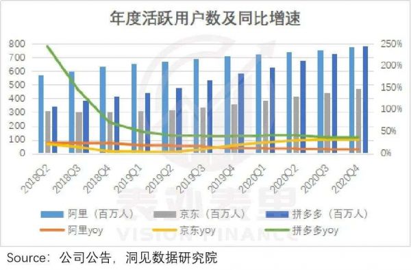 数据显示,截至2020年底,拼多多的活跃买家数量达到7.88亿,已经超过同期阿里巴巴的7.79亿,成为国内用户规模最大的电商平台。