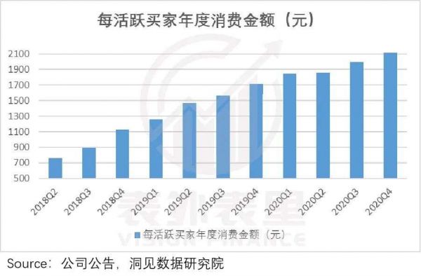 根据拼多多2020Q4电话会议:由于很多新用户仍在建立对平台的信任,所以他们的年消费相对较低。但随着用户在平台上的活跃,他们会在更多类别中进行购买,在每个类别中的平均消费也会随着时间的推移而增加。