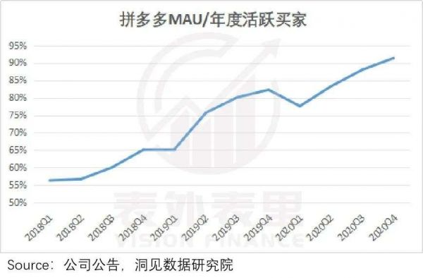 与此同时,拼多多的MAU/年度活跃买家曲线呈现上升的趋势,2020Q4更是超过了90%。这体现出拼多多不断扩充的SKU,的确满足了更多用户的需求。