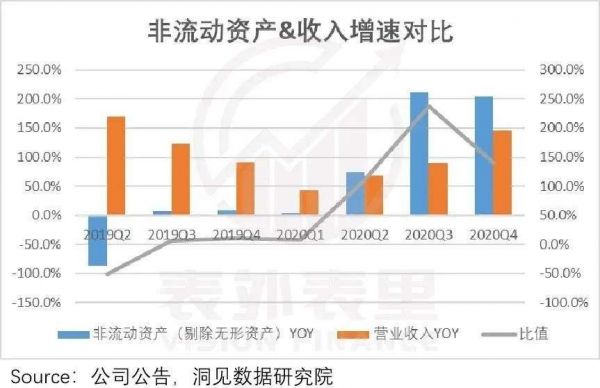 财报数据显示,2020年下半年,拼多多非流动资产的增速明显高于营收的增速。而正常情况下,企业营收或GMV是和非流动资产是呈现一定会计匹配的。