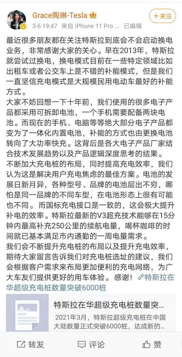 特斯拉全球副总裁陶琳在微博上回应”特斯拉是否会启动换电模式“