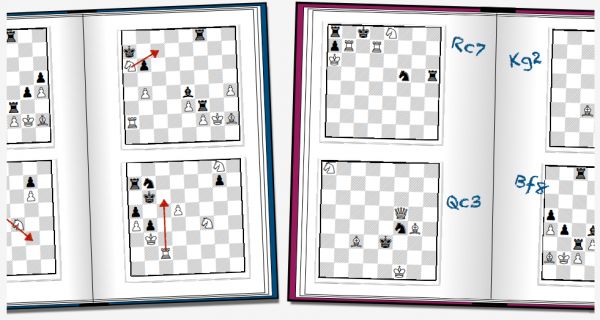 图 3 展示了两种笔记,左边那种笔记很难用再其他的棋谱上(如果棋谱尺寸变化,就不再有用了),但是右图的笔记是可以的。比如如果有第三本棋谱,棋谱的大小比例跟图 3 中的棋谱完全不同,这时出现了跟左图中类似的场景,用箭头就很可能会出错。想象一个比图 3 大一倍的棋谱,那箭头指向的位置可能正好比原来少一半的格子,而用符号描述的方法就不存在这种问题。