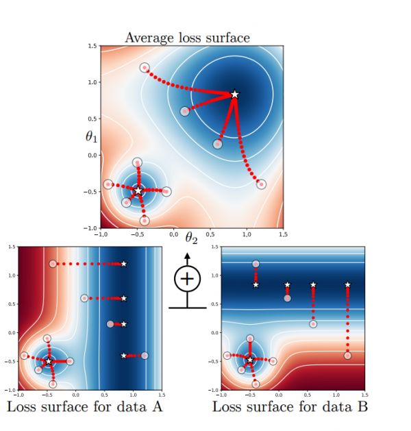 这个问题简单来说就是当数据分布变化时,最优解可能会发生变化,从而也就失去了不变性。为了验证这一点,作者特意生成了两组数据,然后按照传统的训练方法在不同的初始化参数(白色圆圈)下获得了两个局部最优解(星星),但是当这两组数据分开训练的时候,由于生成数据的特殊性,两组数据的损失曲面会在一条线(左下的图是一条竖线,右下图是一条横线)上达到最小值,那么这一条线上的所有点都是局部最优解,会产生很多很多个局部最优解,这种情况下基本就很难在找到最上面图右上角的那个最优解了,除非初始化的参数正好让他们得到了 (0.8,0.8) 这个最优解(概率几乎为 0,相当于 1/*∞*)。