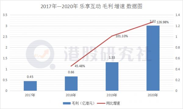 营收高增速的同时也带来了毛利的增速,根据财报显示,2020年乐享互动毛利3.02亿港元,同比增长126.98%,毛利增速也如同营收体量一样,再创历史新高。