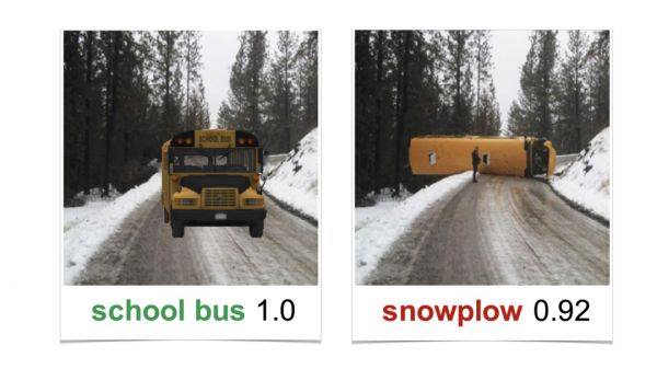 上图是根据M.A. Alcorn等人的 "Strike(with)a pose: Neural networks are easily fooled by strange poses of familiar objects"绘制,显示了一个深度神经网络将一辆公共汽车错误地分类为扫雪车。