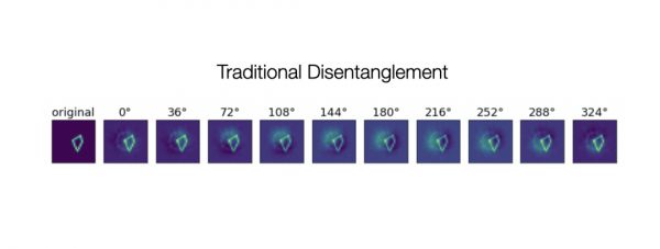 想象一下多个旋转的形状,比如三角形和正方形。解纠缠模型试图将物体的形状和方向这两个变化因素分离成两个变化因素。