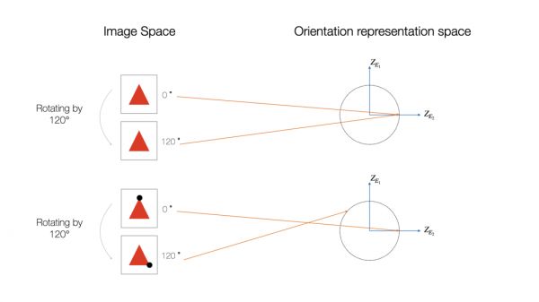 想象一下正三角形的旋转。旋转120度的正三角形与原来的三角形无法区分,导致在方向空间中有相同的表示。然而,通过在三角形的一个角上加一个无穷小的点,表示变得可辨别,违反了连续性。附近的图像映射到相距较远的图像。Facebook AI的研究还表明,拓扑缺陷出现在非对称形状和许多其他常见的变换中。
