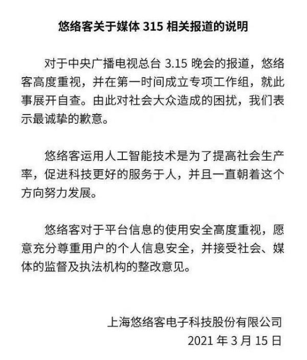 悠络客正是今年3·15晚会被曝光的人脸识别服务供应商之一。3·15晚会后,悠络客致歉,表示成立专项组自查,但未提及具体防范用户隐私泄露的措施。