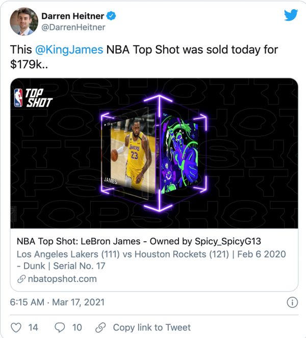 NBA在2019年推出了Top Shot,这是一个专门方便用户通过区块链技术收集和交易NBA精彩视频的市场。它自成立以来已经累计实现2.3亿美元销售额,勒布朗·詹姆斯(LeBron James)和锡安·威廉姆森(Zion Williamson)的个人视频都卖出了20万美元左右的单价。上月,美国网络视频达人罗根·保罗(Logan Paul)以NFT形式出售了一些带有自己卡通形象的宝可梦卡片,总金额超过500万美元。电子音乐制作人3LAU也在2月27日发布了限量版NFT专辑,不到24小时就卖出逾1160万美元。