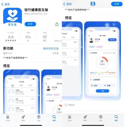 据App Store简介,“轻竹健康是百度灵医智惠一站式健康管理平台。该平台通过连接提供健康管理咨询服务的医生和用户双方,为用户提供多样化、专业化的慢病管理服务。”另一方面,轻竹健康医生版也能成为医生提供智能的慢病管理工具。