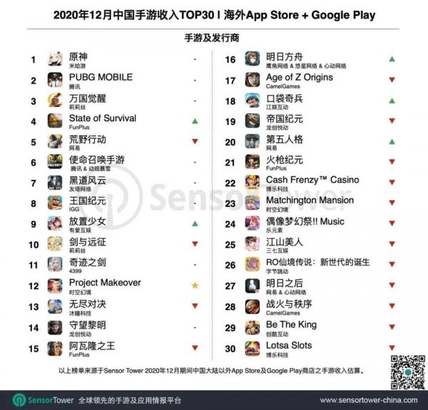 2020年12月中国手游收入TOP30排行榜 / SensorTower
