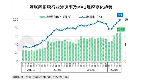 疫情对于使用在线招聘的习惯培养带来了巨大的促进作用。根据极光统计数据显示,2020年3月、4月5月,互联网招聘行业MAU不断突破历史新高,其中5月份互联网招聘行业的渗透率升至9.9%,达到了近年来最高值。