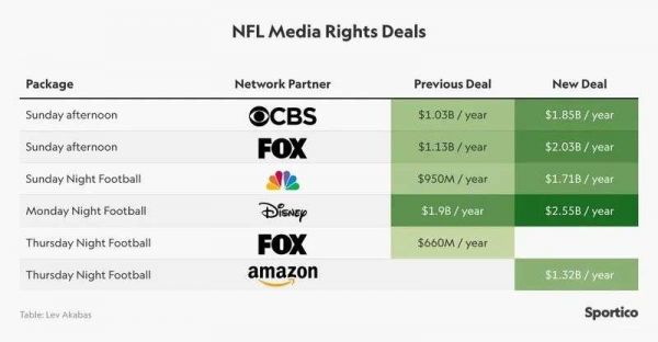 全球体育版权市场受疫情冲击已经超过一年,负面新闻此起彼伏。就在上周,美国终于传来了鼓舞行业士气的消息。NFL职业橄榄球大联盟宣布,与迪斯尼(ESPN/ABC)、CBS、FOX、NBC和亚马逊共五家机构签署了一项为期11年的新转播协议,2023赛季生效,一直到2033赛季结束。