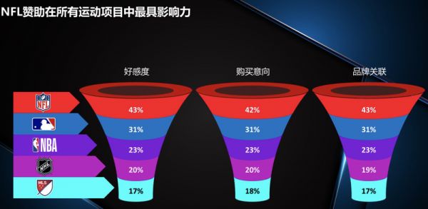 除此之外,NFL在收视率、覆盖粉丝数、品牌好感度、购买意向等多个领域都大幅领先于其他北美职业体育赛事。对于美国市场来说,NFL可能是品牌最高效的选择。