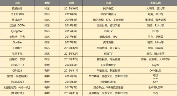 3.2017年,主动接触大众娱乐节目,并合作制作大众主题网综。由视频平台和赛事品牌合作主导,嘉宾是娱乐明星,目的是推广某个游戏或某个赛事,挖掘头部选手比赛之外的价值,同时扩大用户群。代表如《集结吧!王者》《王者出击》《终极高手》《超越吧!英雄》等。