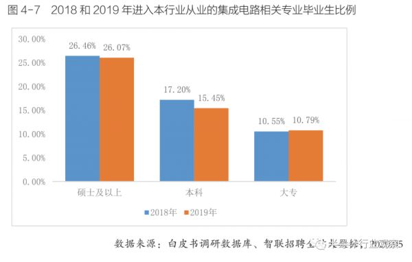 白皮书披露,2019 年我国集成电路相关毕业生规模在 20 万左右,占全国 834 万总毕业生人数的 2.39%,当中有 2.58 万人进入本行业就业,即有 12.92% 的毕业生选择进入集成电路相关产业从业。未进入到本行业从业的毕业生的考量因素可能与产业薪资吸引力不足、专业知识匹配度不够等因素有关。