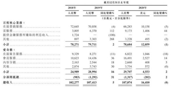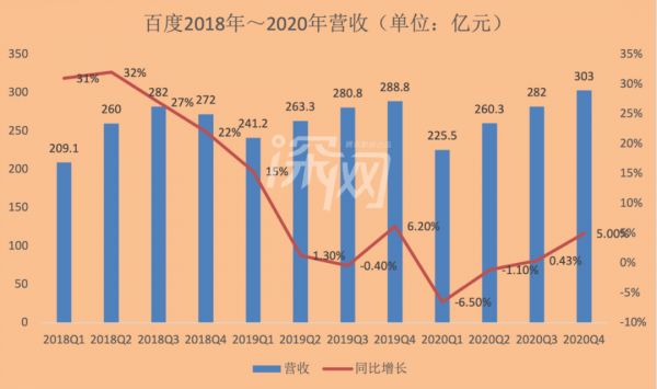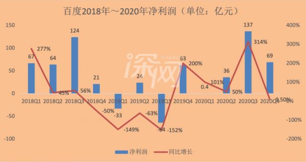 据招股书披露,2018年至2020年期间,百度营业收入分别为1023亿元、1074亿、1071亿,净利润分别为276亿元、21亿、225亿。2019年营收较2018年增长5.02%,但净利润同比下降92.54%,2020年营收同比增速下滑0.32%。