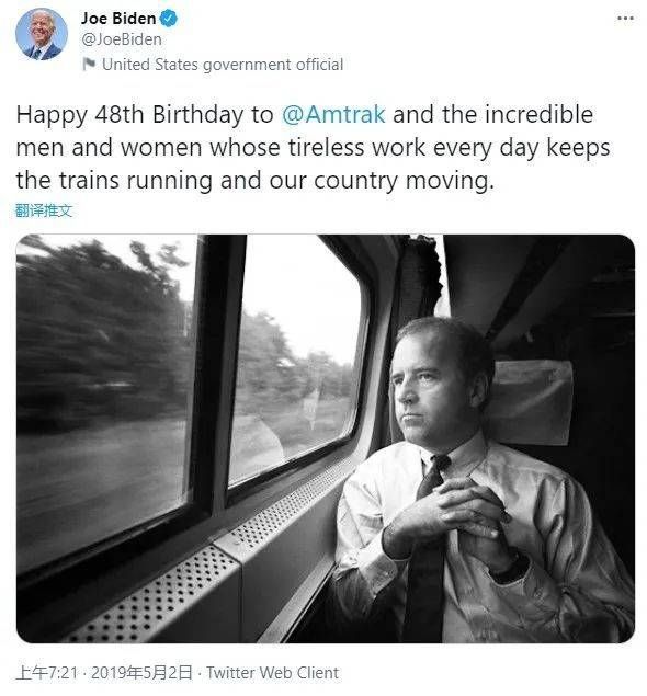 拜登还不忘在推特上贴出一张年轻时搭美铁上班的照片替美铁“庆生”。/@JoeBiden